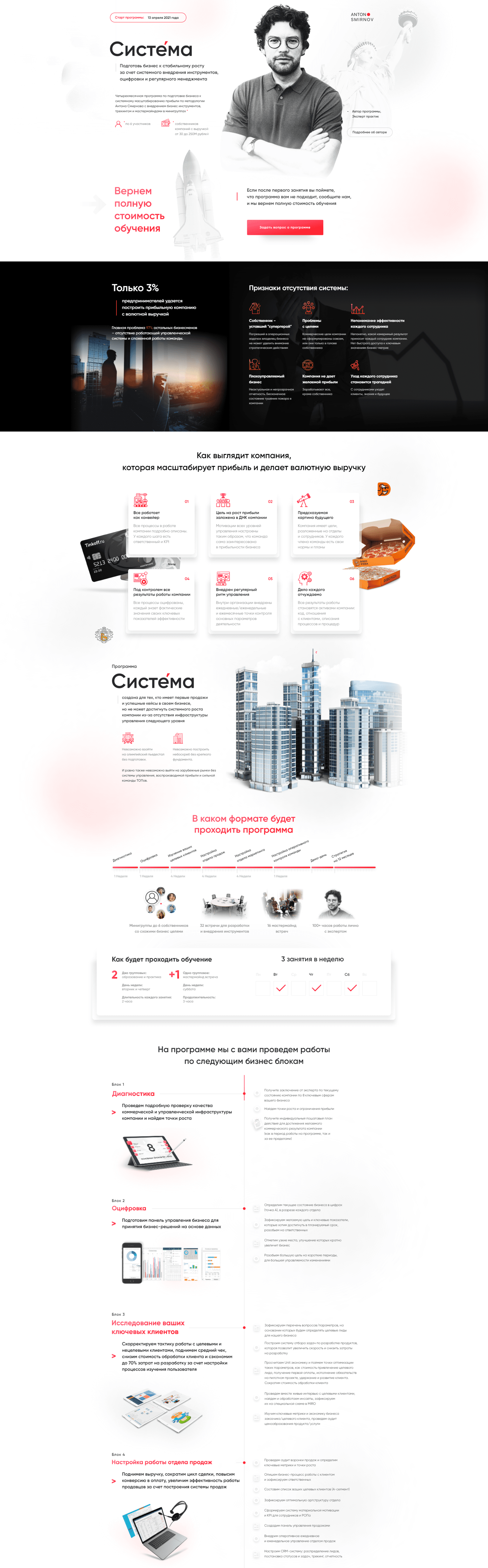 Антон пришел к нам в самом начале запуска своей 4-ех месячной программы для предпринимателей. Основные темы: систематизация бизнеса, поиск точек роста и масштабирование прибыли, выход на международные рынки. Выстраивание стратегии и всех операционных процессов в бизнесе. Формирование команды ТОПов